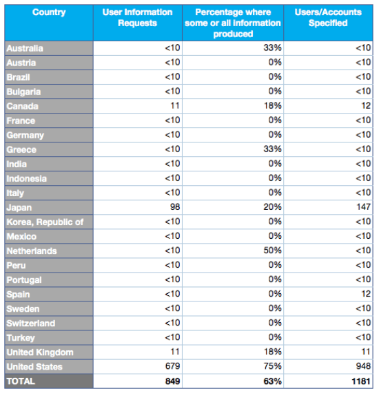 حسب تويتر تم تقديم 849 طلب لمعلومات حول المستخدمين من الموقع من قبل الحكومات حول العالم خلال تلك الفترة . و ما يدعوا للإهتمام أن 679 طلب (أي 75%) من تلك الطلبات تم تقديمها من الولايات المتحدة الأميركية بطلب من المحاكم هناك.