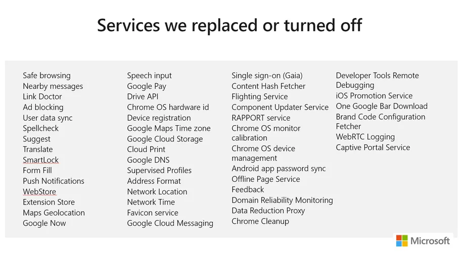قامت مايكروسوفت بإزالة أو استبدال أكثر من 50 خدمة من خدمات جوجل التي كانت جزءًا من مشروع كروميوم بما في ذلك أشياء مثل حظر الإعلانات وجوجل ناو ومراسلات جوجل كلاود وخدمات نظام التشغيل كروم.