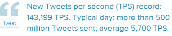 تويتر يشهد عادة في اليوم الواحد 500 مليون تغريدة، أي بمعدل 5,700 تغريدة في الثانية الواحدة.