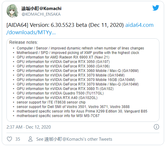 فالقائمة المثيرة للاهتمام، التي تم التقاطها أدناه بواسطة المستخدم Komachi_Ensaka في منشوره على منصة التواصل الاجتماعي ” تويتر”، لا تحتوي على RTX 3050 و RTX 3080 Ti فقط، ولكنها تتضمن أيضاً على عدد من المتغيرات التي ستطرأ على أجهزة RTX 30 الحالية على الهواتف المحمولة.