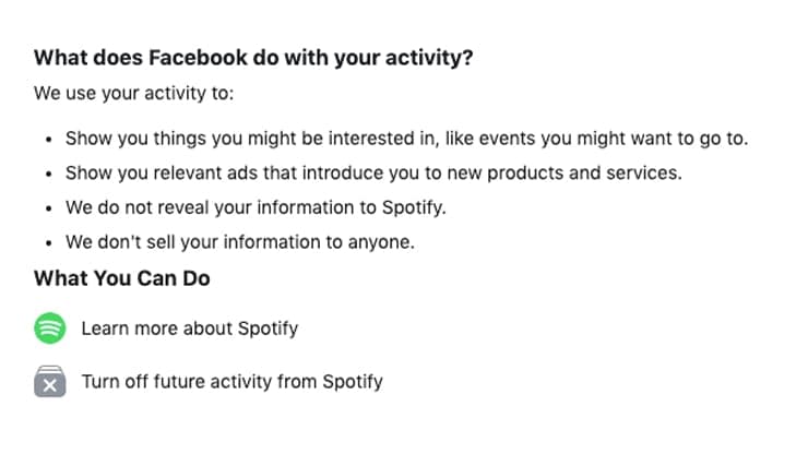 وكي تتعرف على تلك المواقع وتوقف مشاركة معلوماتك مع فيسبوك من خلالها، نشرت فيسبوك أداة تتيح للمستخدمين رؤية تطبيقات الطرف الثالث ومواقع الويب التي تشارك بياناتها مع فيسبوك، وفي نفس الأداة يوجد أيضًا وسيلة لإيقاف مشاركة البيانات.