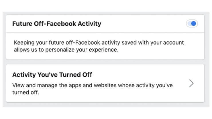 لإيقاف تشغيل مشاركة البيانات في المستقبل لأكثر من تطبيق، اضغط على إدارة النشاط المستقبلي Manage Future Activity، والذي سيُظهر لك نافذة منبثقة يمكنك الضغط فيها على إدارة النشاط المستقبلي Manage Future Activity لتنقلك إلى صفحة أخرى حيث يظهر لك مؤشر لتعطيل النشاط المستقبلي خارج فيسبوك.