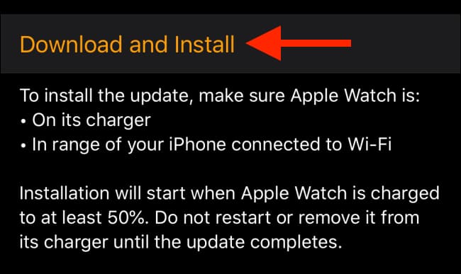 كلما كانت ساعة ابل متصلة بالواي فاي أو الإنترنت عمومًا، سوف تظهر لك التحديثات المتاحة، قم بالتمرير للأسفل ثم اضغط على تحميل وتثبيت Download and Install.