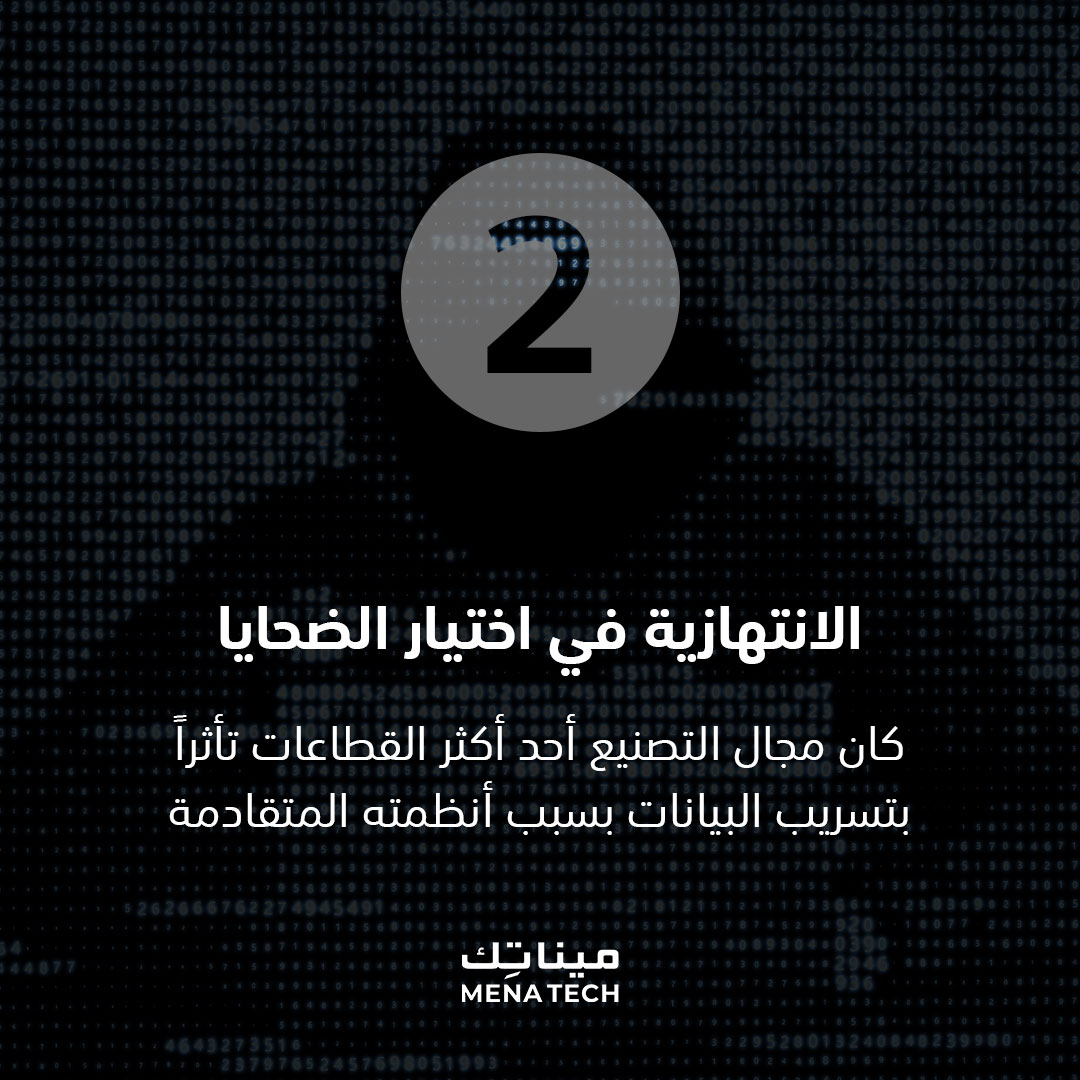 كان قطاع التصنيع أحد أكثر القطاعات المستهدفة خلال 2022، حيث تم التشهير علنا بـ 447 مؤسسة صناعية مخترقة على مواقع التسريب على الإنترنت المظلم. ويعزى ذلك إلى انتشار أنظمة برمجية متقادمة في القطاع الصناعي لا يتم تحديثها أو تصحيحها بشكل سهل أو منتظم، ناهيك عن مسألة التراخي السائدة في هذا القطاع بشأن فترات التعطل عن العمل. وكانت المؤسسات الصناعية الواقعة في الولايات المتحدة الأكثر تضرراً وفقاً لبيانات مواقع التسريب، حيث شكلت 42 بالمئة من التسريبات التي تم رصدها في 2022.