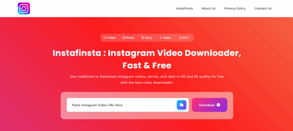 نبدأ قائمتنا حول أشهر 10 أدوات تنزيل صور انستا وريلز بسهولة مع InstaFinsta الذي يعد بلا منازع أفضل برنامج لتحويل وتنزيل فيديوهات إنستجرام إلى صيغة MP4. إذا كنت من مستخدمي إنستجرام النشطين، فغالبا ما سترغب بتنزيل الفيديوهات لمشاهدتها دون اتصال بالإنترنت. لكن إعدادات إنستجرام الافتراضية لا تسمح بذلك، وهنا يأتي دور انستا فينستا. الذي يتميز ببساطته وسهولة استخدامه، مما يجعله مختلفا عن المنصات الأخرى المشابهة. الموقع سهل التصفح وعملية التنزيل سلسة ومباشرة. كل ما عليك فعله هو لصق رابط فيديو إنستغرام في المكان المخصص والنقر على أيقونة تحميل وبعدها سيصبح الفيديو جاهز للتنزيل بأعلى جودة متاحة في لحظات. وبالحديث عن الجودة، يدعم InstaFinsta تنزيل الفيديوهات بجودة عالية. هذا يعني أن بإمكانك الاستمتاع بمشاهدة فيديوهات انستا، سواء كنت تشاهدها دون اتصال بالإنترنت أو تشاركها على منصات أخرى.