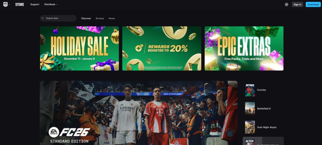 دخلت شركة Epic المنافسة بأسلوب مختلف تمامًا، معتمدة على استراتيجية ذكية تستهدف مصلحة اللاعب المباشرة. الميزة الأهم في متجر إيبيك هي تقديم ألعاب مجانية بشكل دوري، وغالبًا ما تكون عناوين معروفة وليست ألعابًا بسيطة أو تجريبية. هذه السياسة جعلت المنصة خيارًا لا يمكن تجاهله، خصوصًا لمن يرغب في بناء مكتبة ألعاب ضخمة دون إنفاق مبالغ كبيرة.