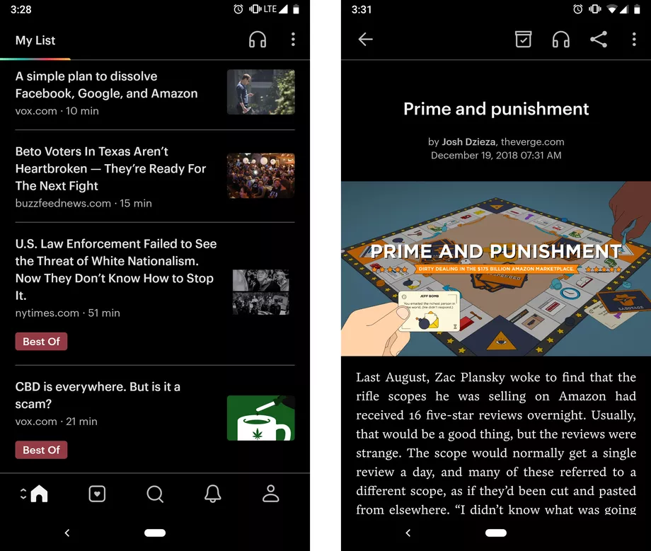 كثيرا ما نرى العديد من المقالات طوال اليوم ولكن حال رؤيتها لا نمتلك الوقت لقراءتها، ويقدم لك التطبيق حلاً فورياً حيث يتيح لك حفظ المقالات بسهولة وسلاسة لقراءتها أو الاستماع إليها في وقت لاحق.