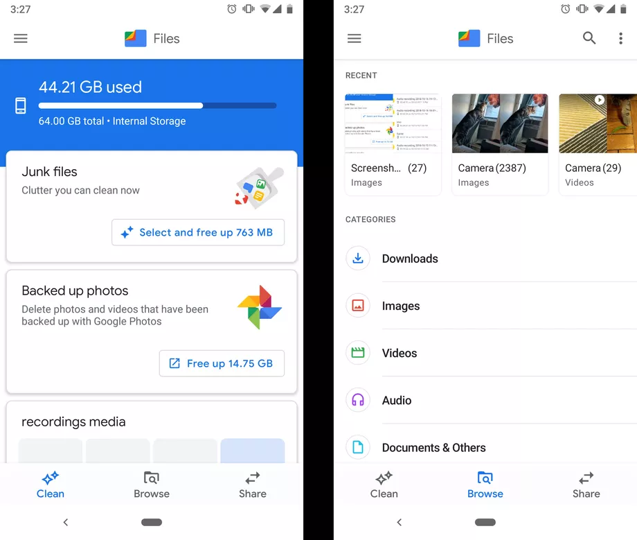 لسبب ما، أصبح تطبيق Google Files مستقلاً بحيث يجب عليك تنزيله من متجر جوجل بلاي، ولكنه مدير جيد للملفات لديك، وبديل مميز للتطبيق الافتراضي المدمج في أندرويد، حيث يوفر لك طرق بحث أسهل في ملفاتك، كما يحدد لك المحتوى غير الهام والذي يشغل مساحة على هاتفك أيضاً.
