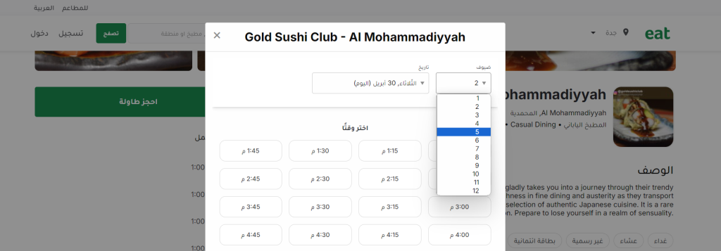 استطاع Eat إثبات قدرته على التواجد ضمن قائمة أفضل 5 تطبيق حجز مطاعم اونلاين في السعودية والبحرين والإمارات ومصر والكويت والعديد من الدول العربية. وما يميز تطبيق Eat أنه يأتي بواجهة سهلة يمكن لأي مستخدم التعامل معها بدون مشكلة ومن خلالها سوف تكون قادر على البحث والعثور على أفضل المطاعم في الرياض أو جدة وغيرها من المدن السعودية. كما يسمح لك بحجز طاولة واستكشاف أفضل المأكولات لأشهر البلدان مثل المطبخ الأمريكي أو الآسيوي أو إذا كنت تُفضل السوشي والأكل الياباني. بضغطة واحدة، سوف تتمكن من العثور على مطعمك المفضل وبضغطة أخرى سوف تتمكن من حجز طاولة في الوقت الذي تريده بكل سهولة.