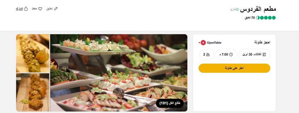 يعد Tripadvisor أحد أكبر المنصات المتخصصة في السفر. حيث يساعدك على معرفة كل شئ عن البلد التي ترغب في زيارتها. بالإضافة إلى التعرف على أهم المعالم وأشهر المناطق. وأيضا يسمح لك بحجز طاولة في المطعم الذي تُفضله بكل سهولة. لكي تتمكن من استخدام أفضل 5 تطبيق حجز مطاعم اونلاين في السعودية. تحتاج إلى تنزيل وتثبيت Tripadvisor على جوالك، ومن ثم اختيار المدينة ونوعية الأكل. سواء كان أمريكي أو آسيوي أو مصري، ستظهر لك مجموعة من النتائج. اختر المطعم الأنسب لك، ولا تنسى تحديد اليوم والوقت وعدد الحضور لإعداد طاولة مناسبة لكم وكل هذا دون الحاجة للبحث وضياع وقتك ومجهودك في الإنتظار لساعات.