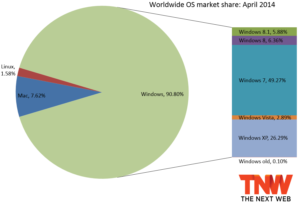 وبشكل عام فإن نظام التشغيل ويندوز ما زال يسيطر على الحصة الأكبر في سوق أنظمة التشغيل بنسبة 90.8% بينما يأتي نظام ابل ماكنتوش في المركز الثاني بنسبة 7.62% في زادت نسبة نظام لينوكس إلى 1.58% في المرتبة الثالثة.