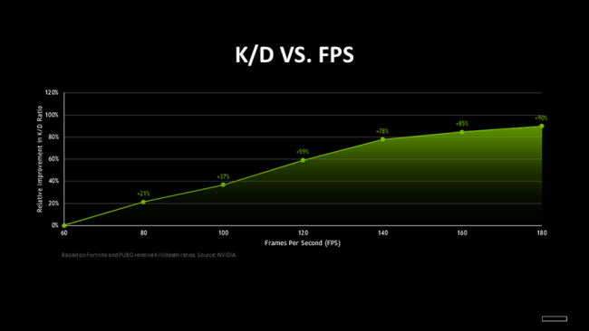 تقول إنفيديا “يمكننا أن نرى أن هناك علاقة بين متوسط الإطارات لكل ثانية ومُعدلات القتل مقابل الوفاة في ألعاب ببجي وفورت نايت. عند 180 إطار في الثانية، يتحسن KD بنسبة 90 في المائة بالمقارنة مع 60 إطار في الثانية… مع وضع ذلك في سياق مميزات الإطارات المرتفعة مثل سلاسة الرسوميات وتقليل التقطيع وزمن الاستجابة، والعلاقة الإيجابية الموضحة في الرسم البياني يبدو الأمر قريبًا من الحقيقة”.