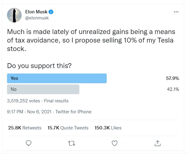 يأتي ذلك بعد أيام من الاستطلاع الذي طرحه على 63 مليون متابع على تويتر عما إذا كان يجب عليه بيع بعض أسهمه من حصته في شركة تسلا و هي شركة السيارات الأكثر قيمة في العالم حيث تقدر قيمتها السوقية اليوم بأكثر من تريليون دولار.