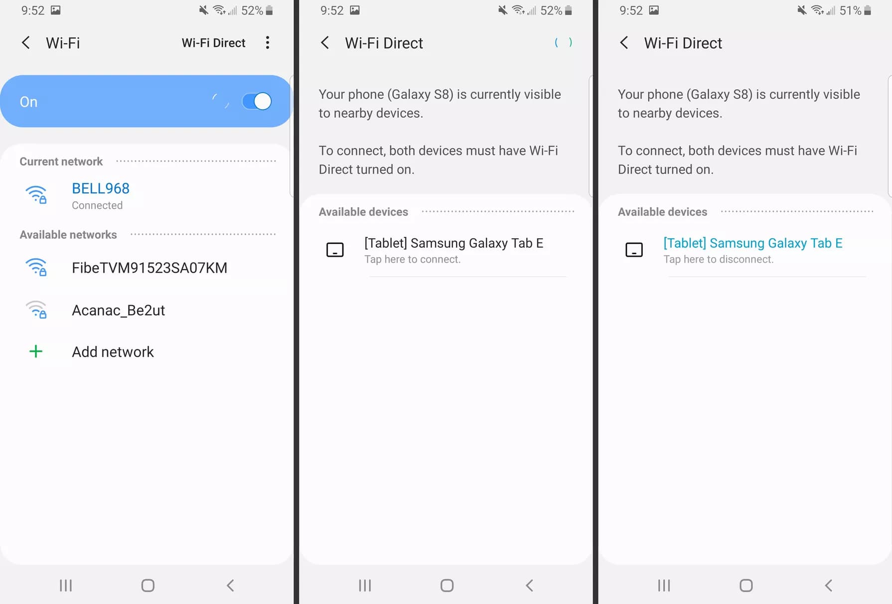 تعمل هواتف ولوحيات سامسونج بشكل رائع مع تقنية Wifi Direct، حيث يمكن للأجهزة القديمة مثل جالاكسي إس 5 أو إس 6 الاتصال مع جالاكسي إس 9 أو 10 بدون مشاكل.