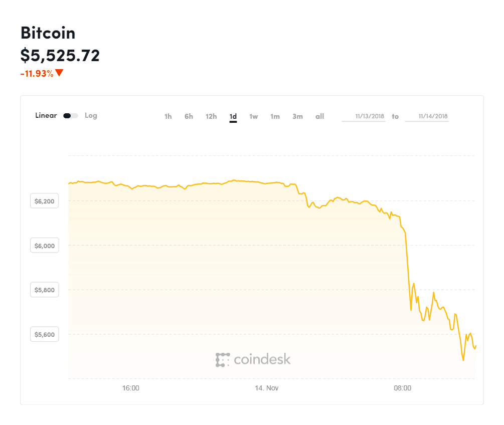 انخفضت عملة البيتكوين إلى 5322 دولار وهي السعر الأدنى منذ أكتوبر 2017 أو قبل الزيادة في الطلب التي دفعت السعر إلى الاقتراب من 20 ألف دولار في ديسمبر الماضي وقد انخفضت بنسبة 70% تقريبًا وهو رقم قياسي في الهبوط ولم تهبط هذه النسبة من قبل طيلة العشر سنوات.