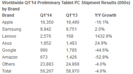 ومن بين الاسماء الكبيرة التي انخفضت مبيعاتها من الاجهزة اللوحية في 2014، نجد ابل وجوجل وامازون. حيث شحنت ابل اجهزة ايباد اقل بنسبة 16.1% في هذه الفترة، في حين ان نسبة جوجل انخفضت بما يعادل 44.6%، بينما شحنت امازون لوحيات اقل بنسبة 52.8%.