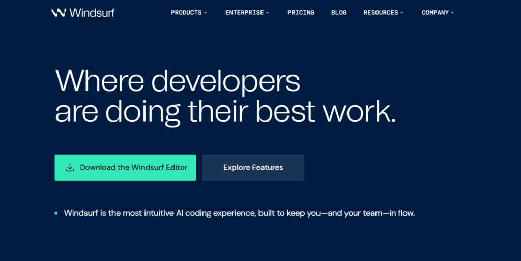 عندما نستعرض أقوى 5 أدوات فايب كودينج (Vibe Coding)، لا يمكننا أن نغفل عن Windsurf لأنه ليس مجرد محرر أكواد. بل يعتبر بيئة إنتاج كاملة تعتمد على فكرة “الوعي السياقي الكامل”. حيث تعمل الأداة على توفير تجربة “تتابع” (Flow) عميق. والفضل في ذلك يرجع إلى الذكاء الاصطناعي الذي يكون على دراية بسياق مشروعك بالكامل ومن ثم يتصرف كشريك وليس مجرد مساعد.