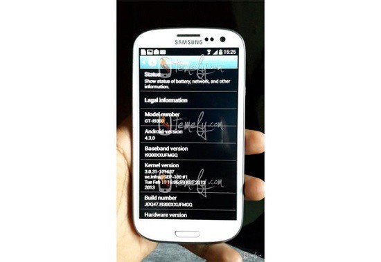 قام أحد موظفي سامسونج الهند بتسريب صورة لهاتف الجالاكسي اس 3 و هو يعمل بتحديث الأندرويد 4.3. و ربما يكون ذلك تمهيداً للكشف عن الاندرويد 4.3 في مؤتمر جوجل يوم الاربعاء.