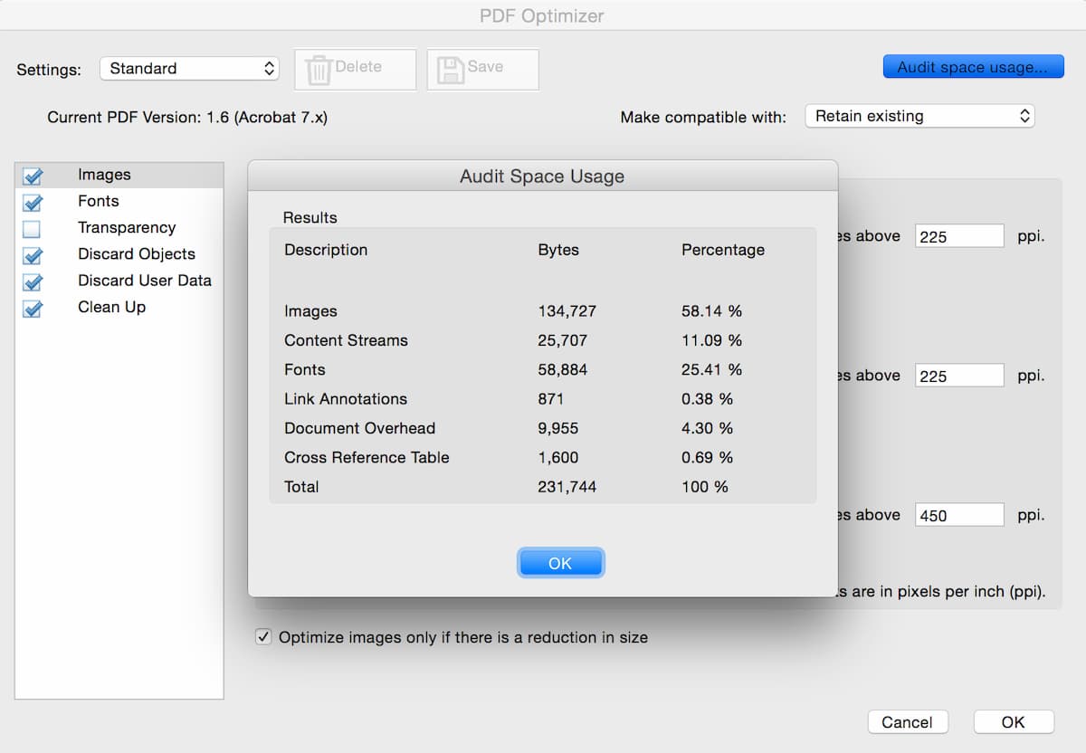 لبدء التحسين، افتح ملف PDF الخاص بك في أكروبات، ثم اضغط على ملف File ثم Save as Other، ثم اختر تحسين بي دي إف Optimize PDF. في المربع الحواري الذي سيظهر، انقر فوق تدقيق استخدام المساحة في الجزء العلوي الأيمن – أو الأيسر حسب اللغة – وسترى جدول معلومات يُشبه هذا: