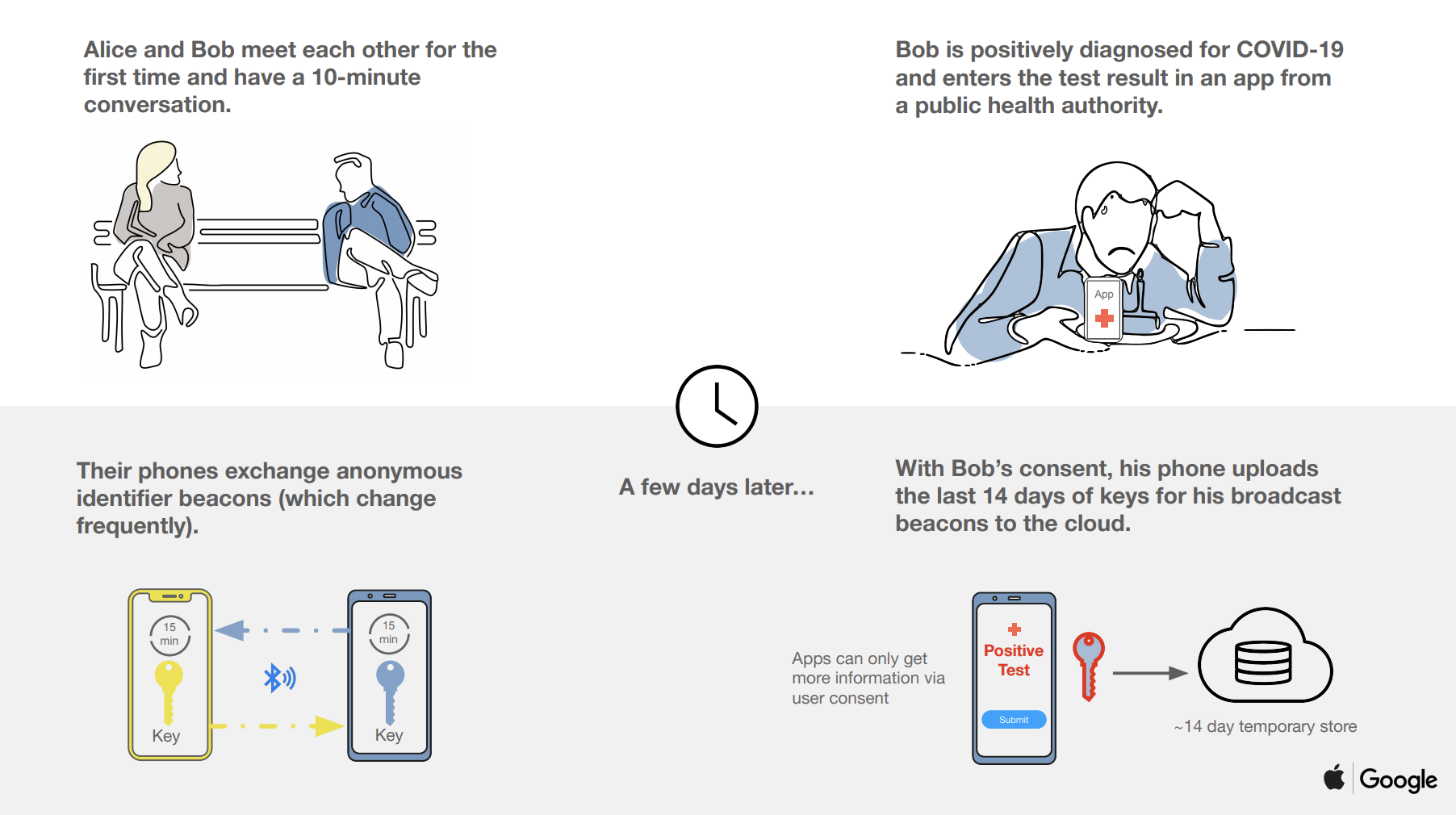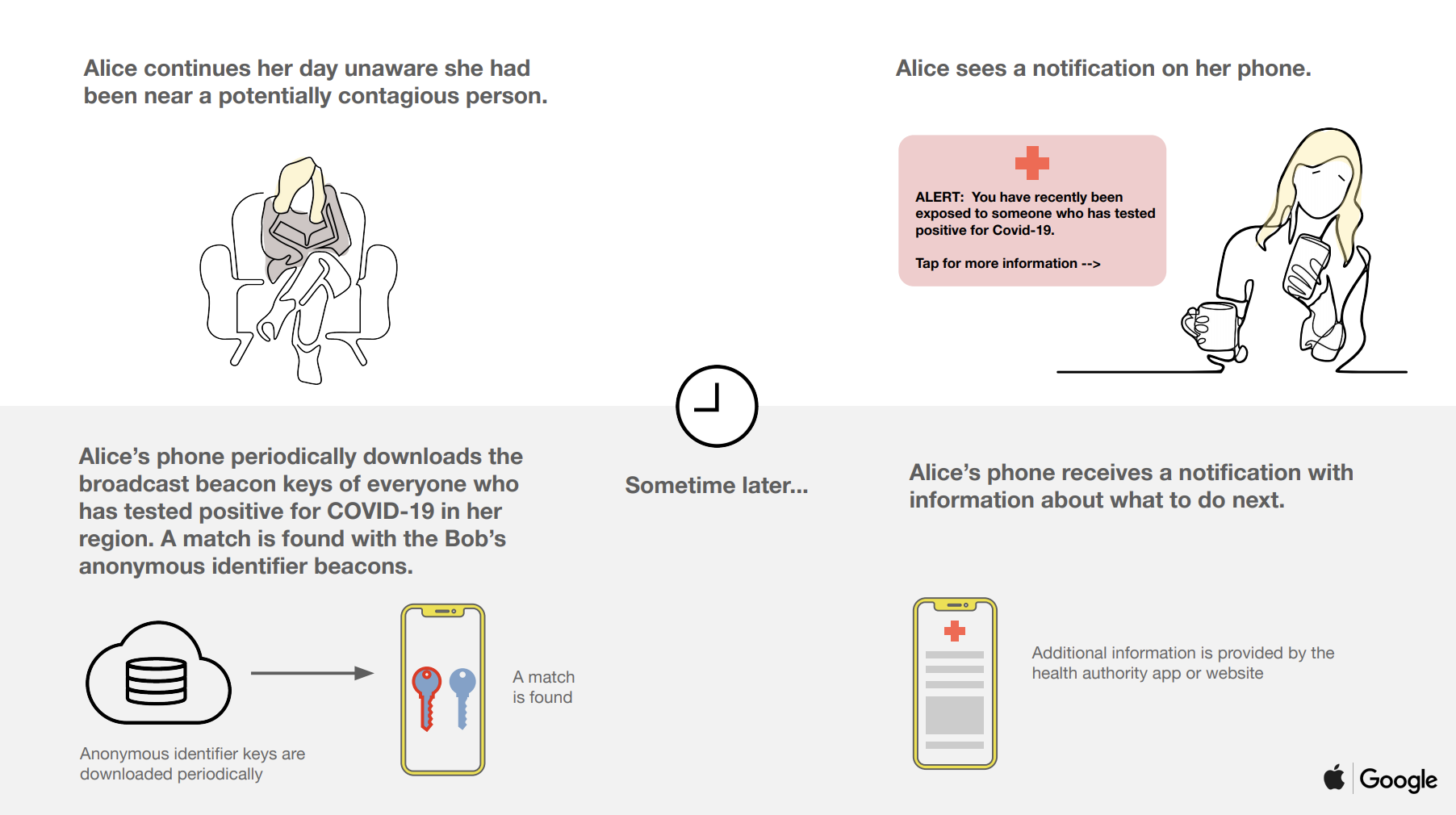 ويعمل النظام الجديد عن طريق استخدام اتصالات البلوتوث قصيرة المدى لإنشاء شبكة تتبع تحتفظ ببيانات واسعة النطاق حول الهواتف التي كانت قريبة جدًا من بعضها البعض، وستكون تطبيقات الصحة العامة الرسمية قادرة على الوصول إلى هذه البيانات، بحيث يقوم المستخدم بالإبلاغ عن إصابته بالمرض (كوفيد-19) ليقوم النظام بعدها بتنبيه الأشخاص الآخرين الذين كانوا على اتصال وثيق به في أوقات سابقة.