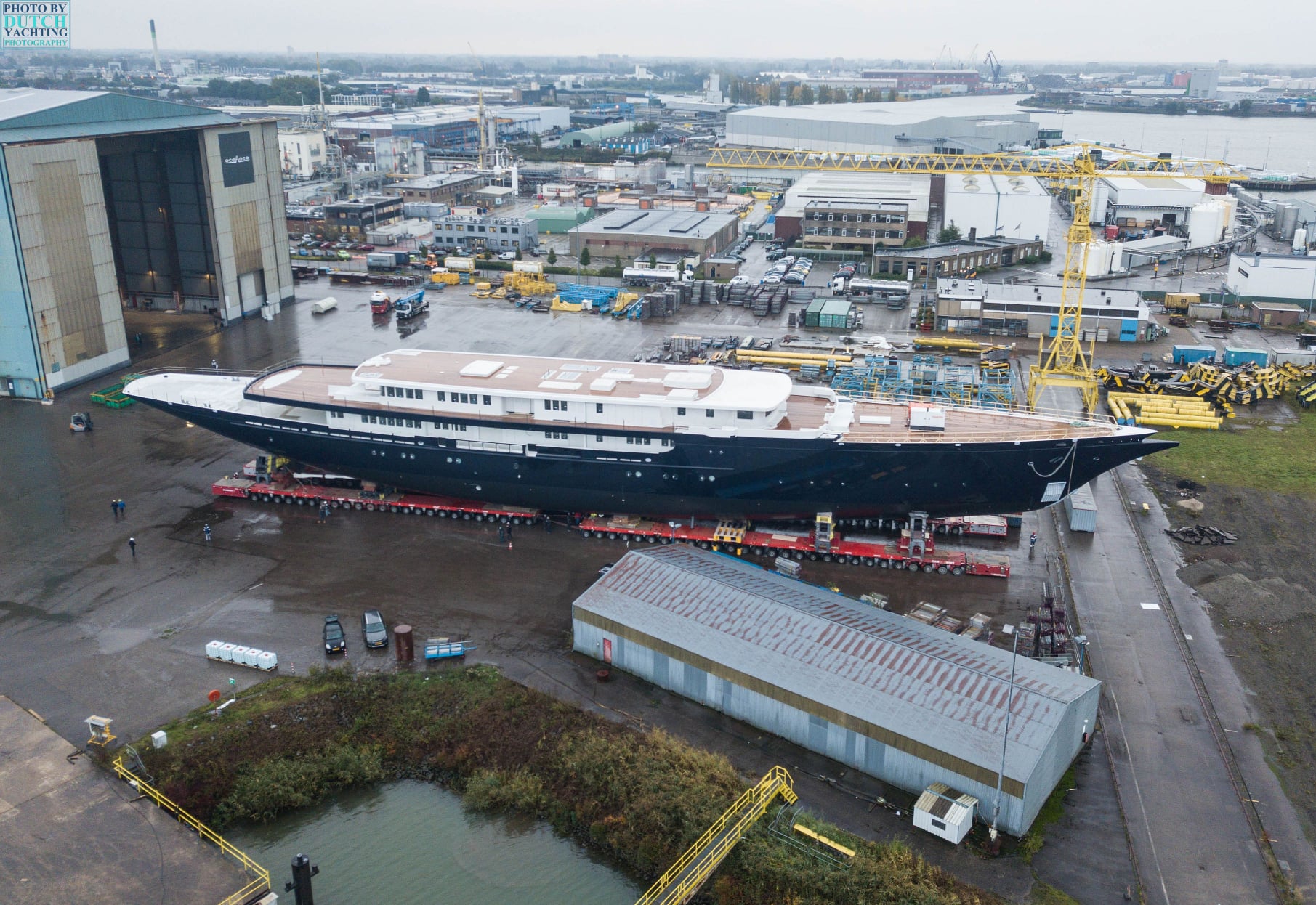 اليخت المقصود هو Y721 الذي تصنعه شركة اليخوت الفاخرة الهولندية Oceanco، حيث يبلغ طول اليخت ما يزيد عن 127 متراً مما يجعله أكبر يخت في العالم عند إطلاقه مع نهاية العام الجاري. وبالنظر إلى امتلاك اليخت لأشرعة، فهو يمتلك 3 صواري مرتفعة تحمل أشرعته وتوفر له قوة الجر الهائلة اللازمة لتحريكه. المشكلة هي أن هذه الصواري تتجاوز 40 متراً بالارتفاع، وبالنظر إلى كون اليخت يبنى في حوض داخل هولندا وليس على الساحل تماماً سيكون خروجه مشكلة.