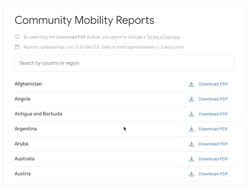 واستخدمت جوجل تقارير البيانات في توضيح درجة التزام الناس بالتعليمات الحكومية بخصوص البقاء في المنزل، والعمل منه إن لزم الأمر.