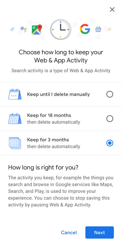 يُمكنك تحديد وقتًا زمنيًا لمدة حفظ بيانات نشاطك عبر الويب وهي ما بين 18 شهر أو 3 شهور ثم يقوم الحساب تلقائيًا بحذفها من حسابك على أساس مستمر، وهناك عنصر تحكم فإتاحة الحذف اليدوي العادي.