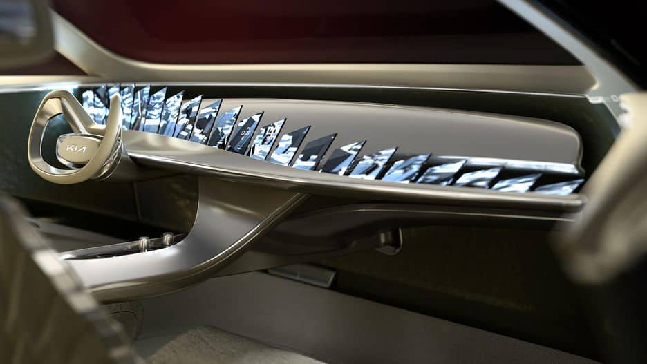 تهدف شركة كيا بهذا العدد من الشاشات السخرية من تنافس الشركات المصنعة للسيارات في إنتاج السيارات بأكبر شاشة ممكنة، فعند ركوب السيارة ستبدو الشاشات الـ 21 وكأنها شاشة واحدة.