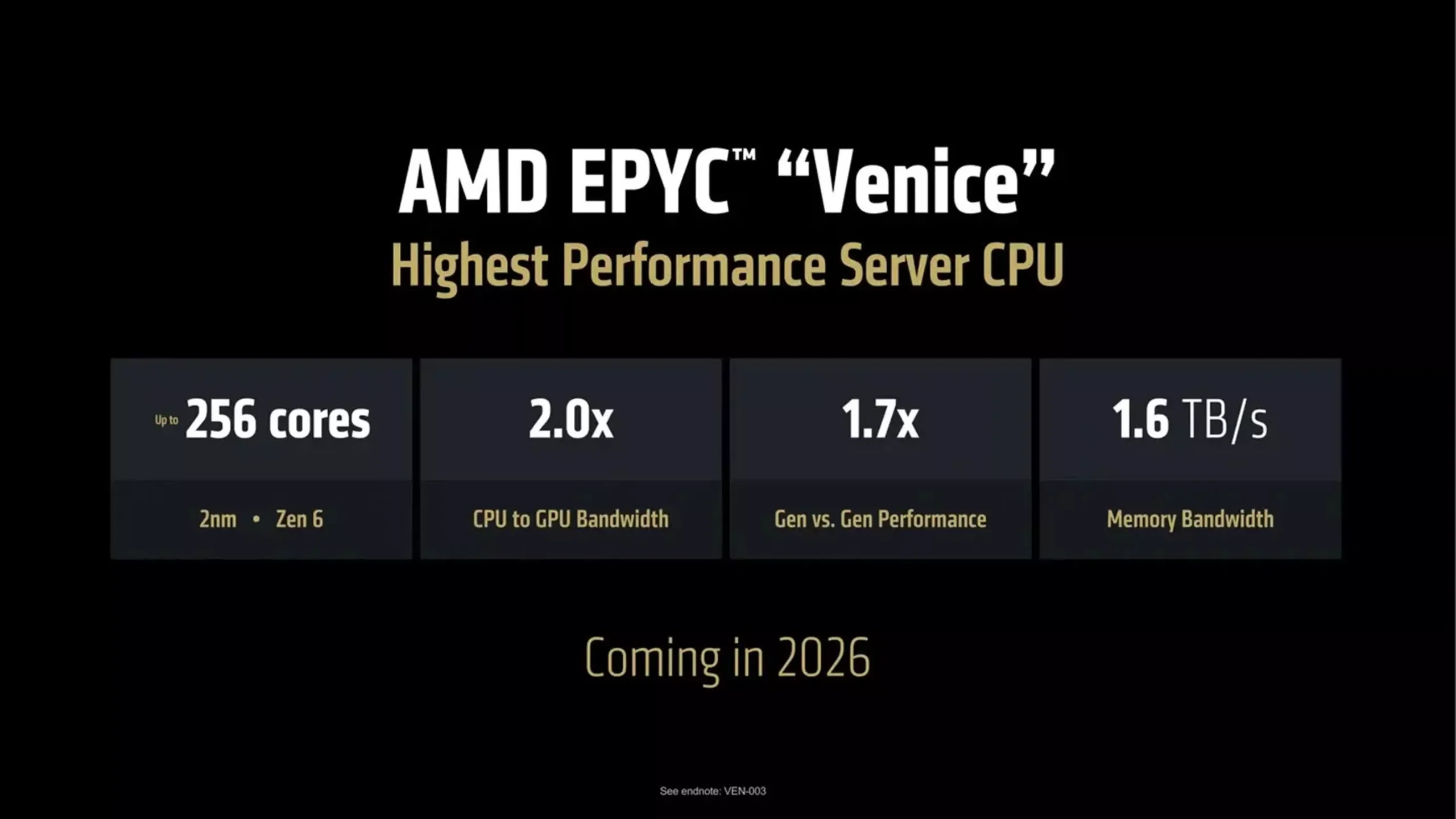 أعلنت شركة AMD عن معالج Venice ضمن حدث Advancing AI الأخير للشركة، وهو مبني على جيل Zen 6 من معمارية AMD الجديدة، ومن المقرر إطلاقه عام 2026 لتلبية الاحتياجات المتزايدة للذكاء الاصطناعي والحوسبة السحابية والتحليلات عالية الأداء.