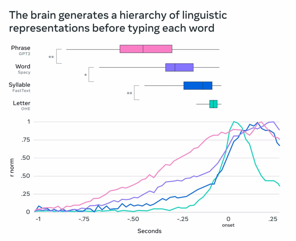 سلطت أبحاث Meta الضوء على كيفية معالجة الدماغ للغة عصبياً، إذ اكتشف العلماء أن إنتاج اللغة في الدماغ يتم وفق بنية هرمية، تبدأ بإشارة أولية للجملة، تليها إشارات منفصلة للكلمات، ثم المقاطع الصوتية، وأخيراً الحروف الإفرادية.