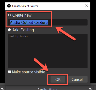 في نافذة Create/Select Capture قم بتسمية مصدر صوت سطح المكتب ثم انقر على OK للتأكيد.