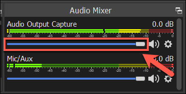 ضمن قسم Audio Mixer في برنامج OBS يجب أن تتحرك أشرطة تمرير الصوت لـ Audio Output Capture لإظهار التقاط الصوت وجاهزيته للتسجيل.