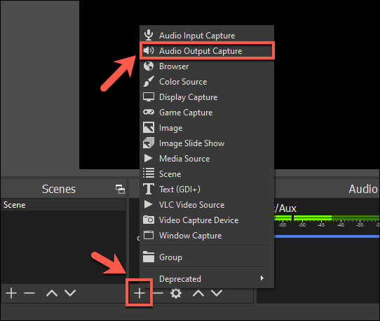 لتسجيل صوت Discord باستخدام برنامج OBS، انقر على علامة + في منطقة Sources داخل نافذة البرنامج، ثم اختر Audio Output Capture من القائمة لتحديد إخراج صوت سطح المكتب للتسجيل.