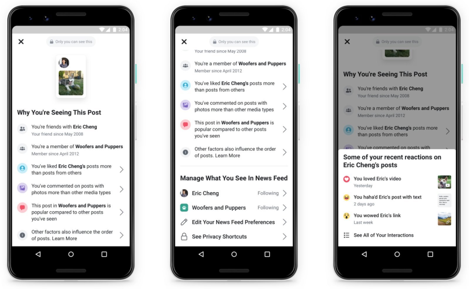 تتيح لك هذه الميزة الجديدة بسهولة إدارة المشاركات التي تتفاعل معها على الموقع، تقول الشركة أن هذه هي المرة الأولي التي تقوم فيها ببناء معلومات حول كيفية عمل ترتيب لخلاصة الأخبار مباشرة في تطبيق فيسبوك، مشيرة إلى أن ذلك جزء من جهودها لتكون أكثر شفافية مع المستخدمين حول كيفية استهداف الخوارزميات.