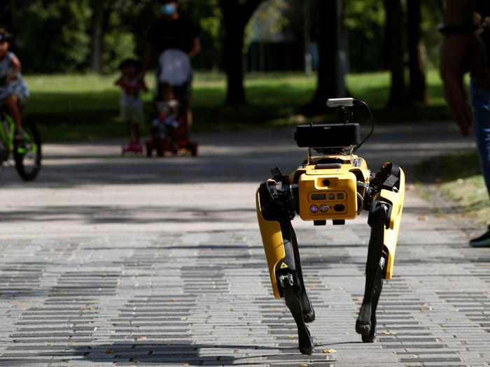 وفي حديقة سنغافورة، تم استخدام Spot لتشجيع التباعد الاجتماعي بين الناس بسبب فيروس كورونا.