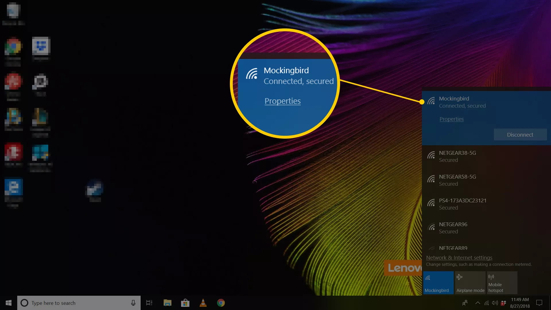 في الإصدارات الأحدث من ويندوز يمكنك اختيار أيقونة الواي فاي من شريط المهام لرؤية الشبكة اللاسلكية التي تتصل بها، وتظهر هذه الأيقونة على هيئة خمسة أشرطة تشير إلى قوة إشارة الاتصال.