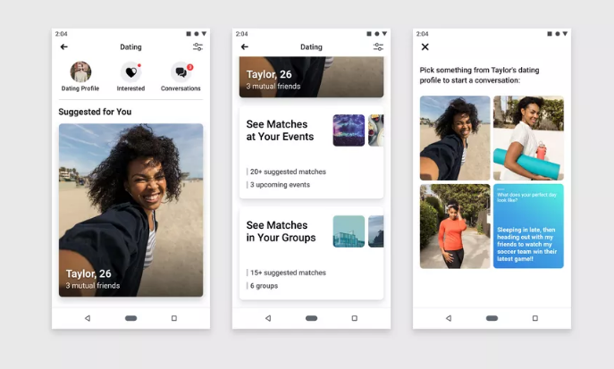 قدم فيسبوك خدمة مواعدة في مؤتمر المطورين للعام الماضي، لكنه أعلن هذا العام أن خدمة المواعدة توسعت إلى 14 دولة أخرى، وقدم ميزة “الكراش السري” والتي تسمح لك بإنشاء قائمة سرية لأصدقائك من فيسبوك الذين تنجذب إليهم سواء كان لديهم ملف تعريفي على خدمة المواعدة أم لا، وإن كانوا يستخدمون الخدمة أيضًا وقاموا بإضافتك إلى قائمتهم فسيقوم فيسبوك بإبلاغ الحبيبين ليبدأ كل منهما بالبوح بكل ما بداخله.