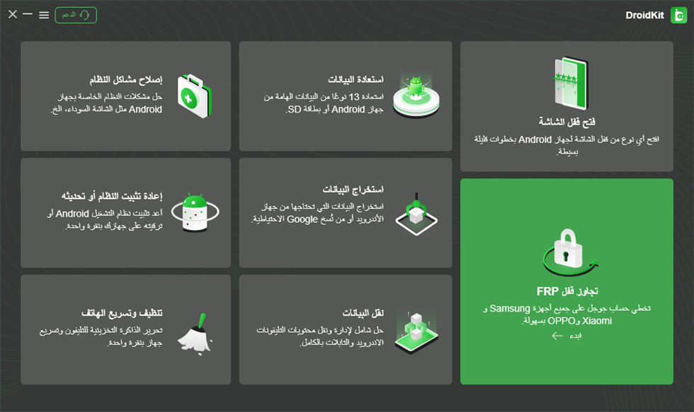 في حال عدم نجاحك مع الطرق السابقة، حينها يمكنك تجربة طريقة سهلة لمساعدتك على تخطي حساب جوجل بعد الفورمات أو ضبط المصنع، لكنها تعتمد على أحد البرامج الخارجية مثل DroidKit ويمكن استخدام تلك الطريقة على جميع هواتف الاندرويد مثل شاومي وريدمي وسامسونج وأوبو وهواوي وغيرهم وإليك الخطوات: