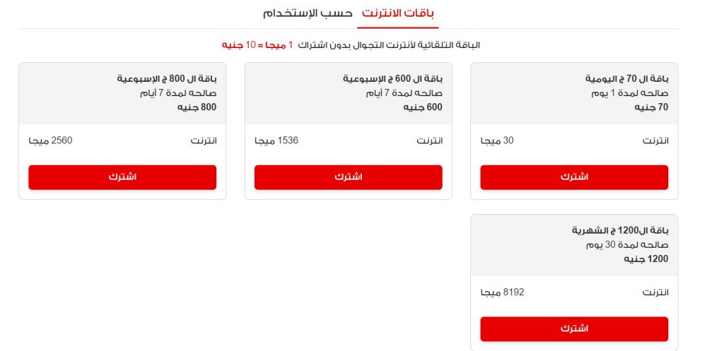• باقة الـ 1200 جنيه الشهرية: تمنحك انترنت 8192 ميجا بسعر 1200 جنيه صالحة لمدة 30 يوم.