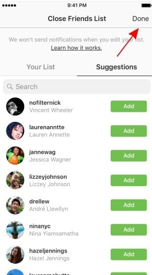 - انقر على “تم” في الجانب العلوي الأيسر عندما تختار أصدقائك المقربين.