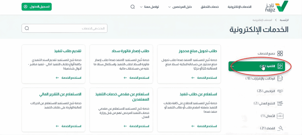 - اختيار خدمة الاستعلام عن طلبات التنفيذ.