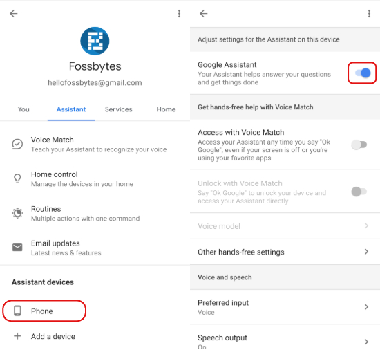 - الآن، اختر هاتفك ضمن “الجهاز المساعد” وقم بإيقاف تشغيل مساعد جوجل مرة واحدة وإلى الأبد.