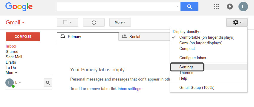 الخطوة 1: في حساب جيميل الثانوي، انقر أيقونة الترس على اليمين واختر الإعدادات.