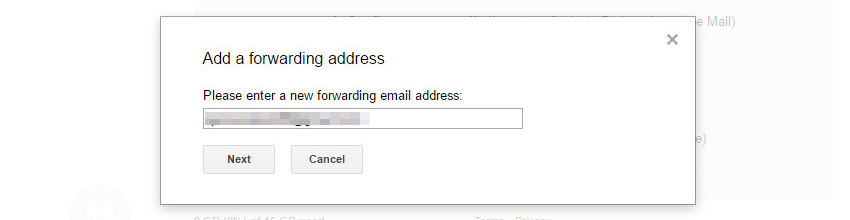 الخطوة 4: ادخل عنوان البريد الإلكتروني الذي سيتلقى بريدك الإلكتروني المعاد توجيهه، ثم انقر على “التالي” للمتابعة وستعرض لك نافذة تأكيد عنوان إعادة التوجيه.