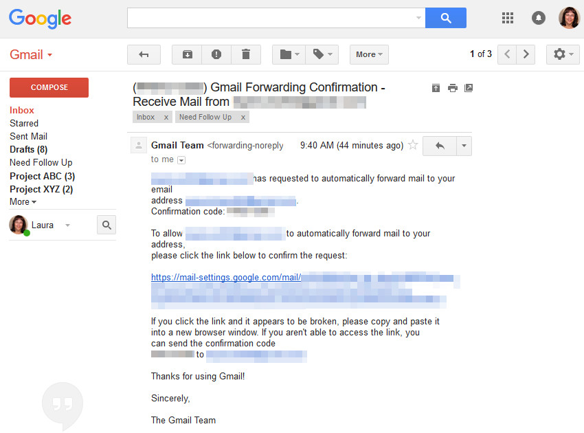 الخطوة 7: أدخل رمز التأكيد في علامة التبويب إعادة التوجيه في حساب جيميل الثانوي، ثم انقر على رابط التأكيد في البريد الإلكتروني.