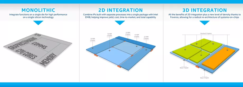 صرحت شركة انتل باستراتيجية واضحة على نحو غير عادي لتطوير معالجاتها المستقبلية، والتي يدور معظمها حول تجزئة العناصر المختلفة لوحدة المعالجة المركزية الحديثة إلى رقاقات فردية قابلة للتكديس.