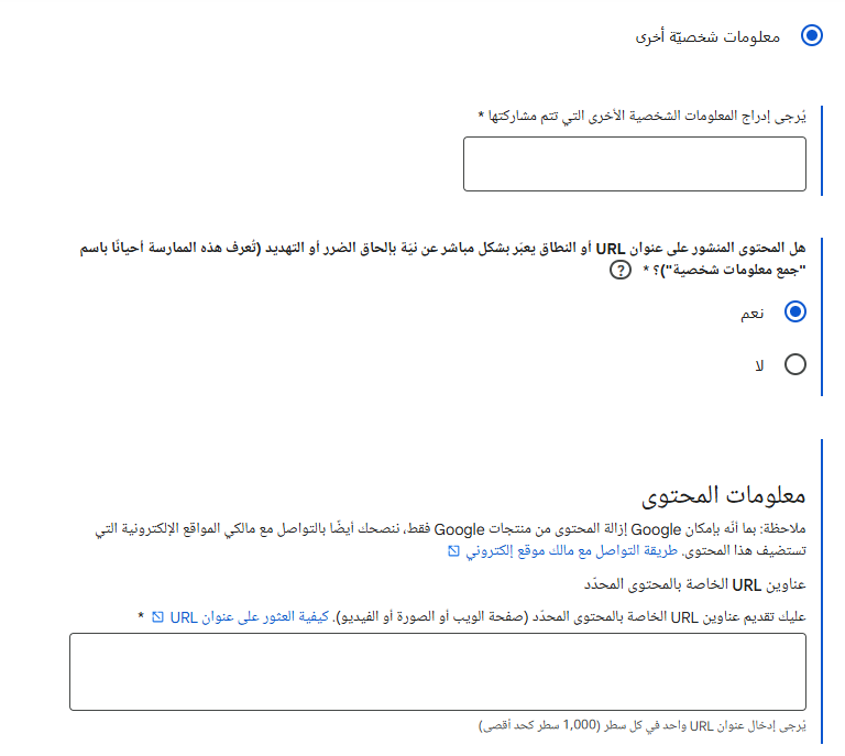 - تحتاج لتوضيح هل المحتوى خاص بك أم تقوم بتقديم طلب نيابة عن شخص آخر