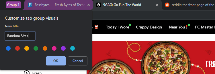 يمكنك أيضًا النقر فوق الخيار مجموعة علامات التبويب لتغيير اسمه أو لونه حسب رغبتك، وتعيين كل فئة بلون مختلف، وقد لا تجد هذه المميزات متاحة في متصفح كروم العادي، وإنما في متصفح كناري.