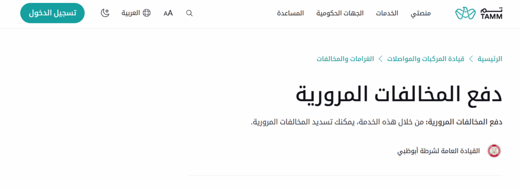 توجه إلى موقع TAMM ثم قم بتسجيل الدخول. اختر قيادة المركبات والمواصفات ثم اضغط على الغرامات والمخالفات. أدخل البيانات المطلوبة مثل رقم الهوية أو رقم اللوحة أو رخصة القيادة. راجع التفاصيل ثم قم بإكمال عملية الدفع بأمان.