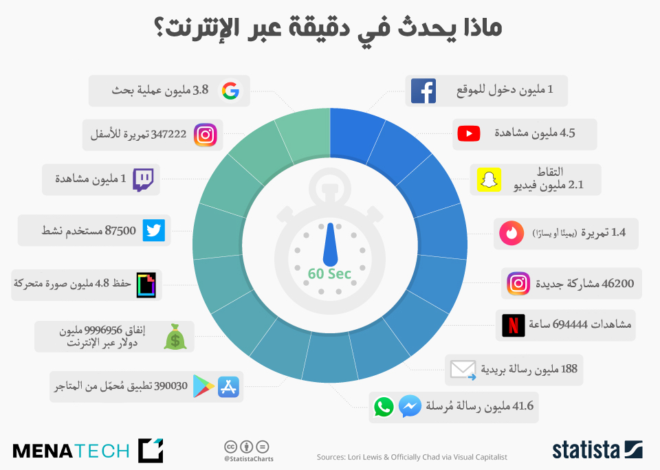 وفقًا لبيانات فيجوال كابيتاليست، في دقية واحدة يتم تسجيل دخول مليون شخص عبر موقع فيسبوك، ومشاهدة 4.5 مليون مقطع فيديو عبر يوتيوب والكثير من الأشياء التي يُمكنك معرفتها من خلال الرسم المعلوماتي التالي: